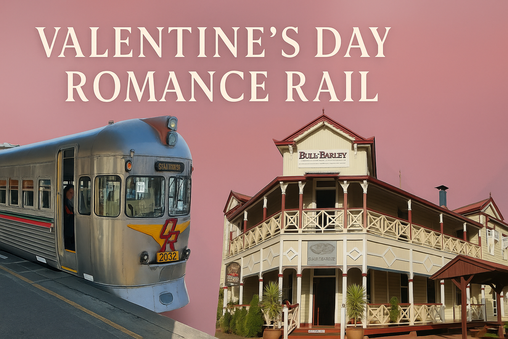 Indulge in a romantic evening on DownsSteam's Commissioner's Railmotor and enjoy a specially curated Dinner at Cambooya's Bull and Barley Inn for Valentine's Day with the one you love.